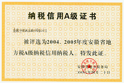 我公司继被省地税局评为“2001-2002年度省地税A类纳税信誉等级单位”后,近日又被省地税局评为“2004-2005年度安徽省地方税A级纳税信用纳税人”。这是省地税局对纳税人给予的最高荣誉,也充分体现了省地税局对我公司近年来在税务登记、纳税申报、税款缴纳、财务管理、纳税资料报送、发票管理等方面工作的认可。