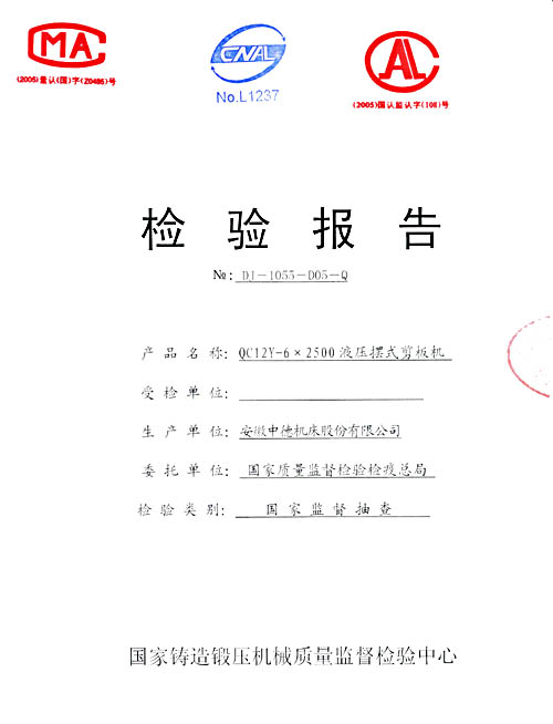 根据2006年第4季度剪板机国家监督抽查实施方案,受国家质量监督检验检疫总局委托,国家铸造锻压机械质量监督检验中心,于2006年9月23日,对本公司产中德牌液压摆式剪板机进行了现场检验。近日,我公司收到了本次抽检的结果通知单及检验报告,结果为:合格。