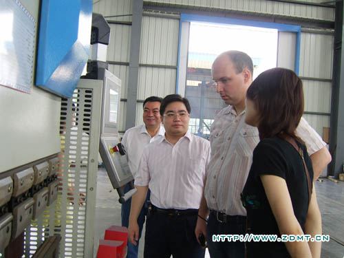 在中德公司领导的陪同下,尼尔森先生来到了我们的车间。尼尔森先生尤其关注数控类机床,对数控机床成品都一一细细查看。在正在生产中的大型数控双机联动折弯机前,尼尔森表现出了极大的兴趣,认真的向负责人了解机器的情况。在大型装配车间,尼尔森一行对中德车间的管理布局及环境表示了赞扬,虽然天气很热,干净整洁的车间环境让他们轻松地进行参观。另外,负责人还向他们介绍了产品设计方面的一些小细节如夹块、T型槽等等,这些细节体现出了中德产品使客户在使用产品过程中将会得到极大的便利。