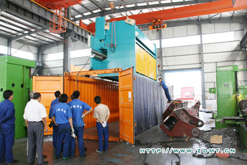 这套大型机床主机由两台250吨6米的数控板料折弯机组成,可实现单机及双机联动工作的功能,极大的方便了大型生产中的多元化要求。机器总重达50余吨,可完成12米的工件,对装箱的操作技术要求很高,但由于我们机械化的车间及熟练的技术人员,装箱过程虽然繁琐但并不费力。由于整机超高超长,采用的是两个开顶箱,将两台主机分开来装。考虑到机器要在海上航行近一个月,装箱的工作人员做足了防护措施:底部钢条固定,两侧铁丝固定,外加透明塑料膜,顶部自制框架固定并套上雨布等等,以免在运输过程中造成对机器不必要的损坏。