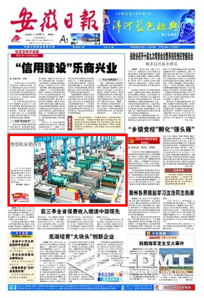 今日(2009年11月11日)《安徽日报》头版刊载《博望机床销四方》的图片新闻报道。在我公司大型车间图片中,配出如下文字报道:11月6日,位于当涂县博望镇的民营企业江南体育官方下载 生产车间里一片繁忙。该企业今年前三季度销售量同比增长35%,产品出口30多个国家和地区。(特约摄影 谢富乐)