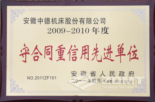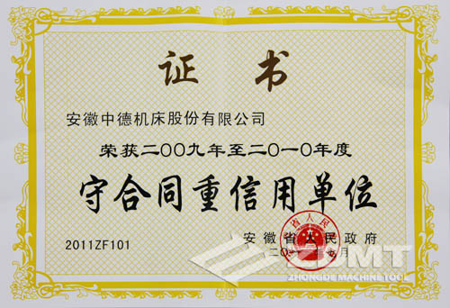 这也是我公司第三次获得省政府授予的“守合同重信用先进单位”称号,公司不断发扬“守合同、重信用”的良好传统,不断探索、潜心经营,逐渐建立、健全了一套适合市场规律和行业、企业自身特点的合同管理机制,强化了合同的管理,确保了合同的履行,呈现出合格率100%,优良率85%以上,履约率达100%的喜人景象,取得经济效益和社会效益的双丰收,赢得了社会各界的广泛认可,增强了社会大众对“中德机床”品牌的认知度,加速了品牌传播、提升了品牌知名度,树立了中德机床公司良好的社会形象。