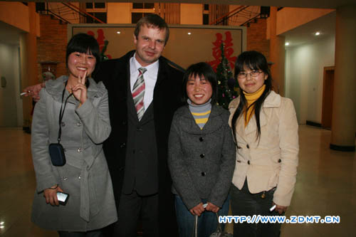 On Feb 22th 2008, Mr Pointner, a managing director from Austria, pays a visit to ZhongDe. His company is a wholesaler of metal working machines and forklifts in Austria. He has tracked in lots of cities in China and is deeply interested in chinese traditional culture. Though knowing little chinese word, he says fervidly “你好"(hello) “谢谢"(thank you) to almost every body he sees.